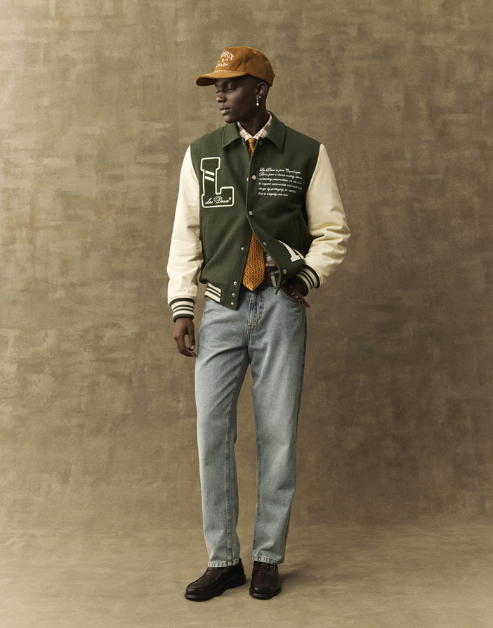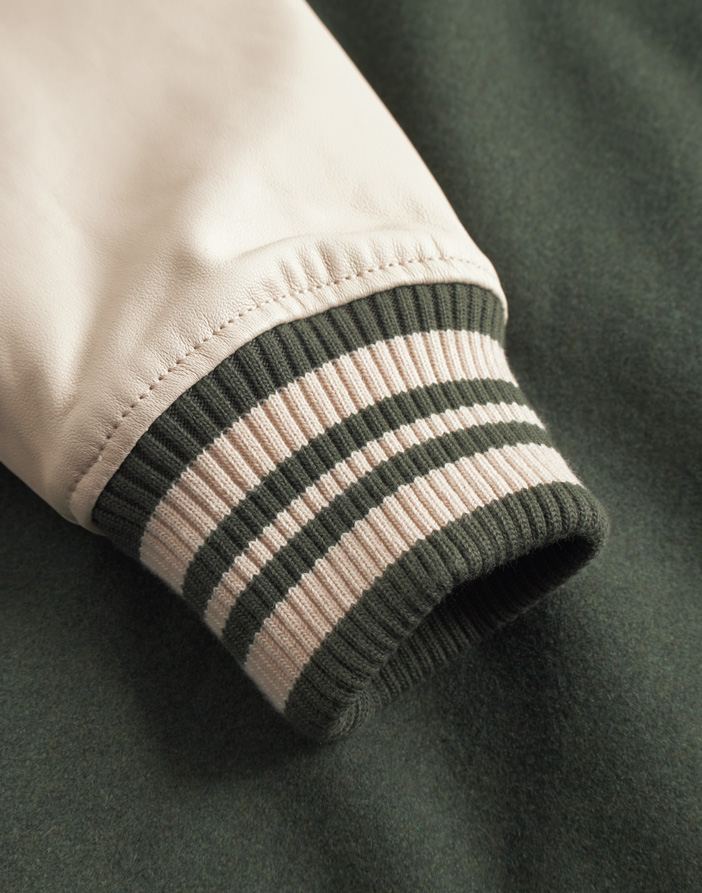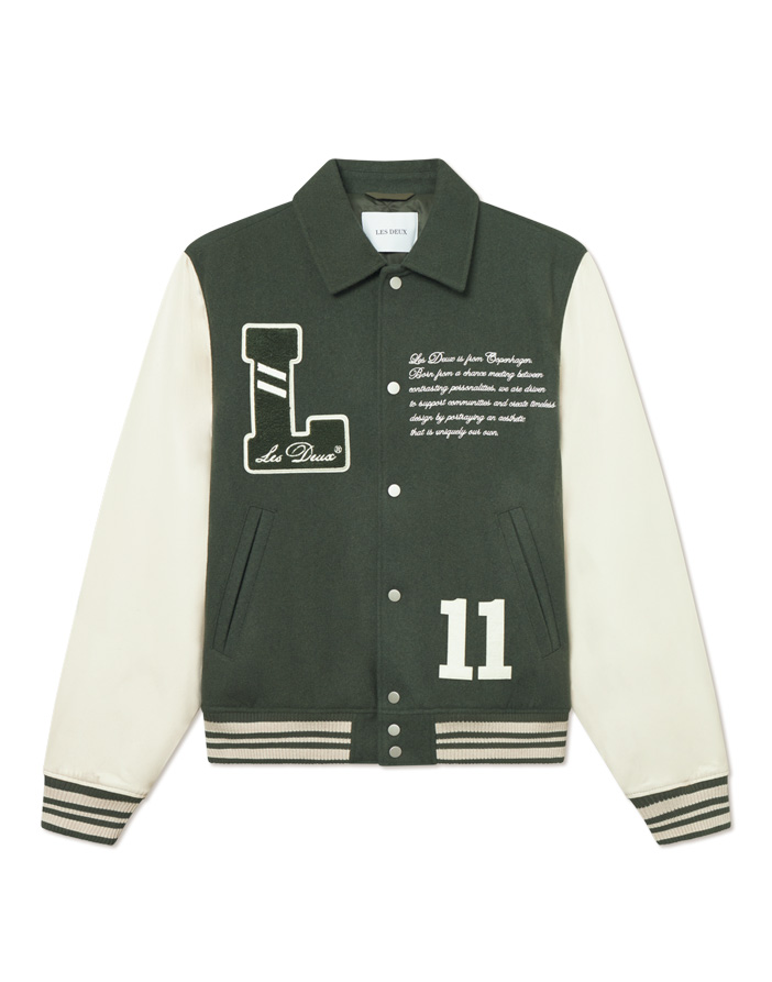 Les Deux Varsity Wool Jakk Duffel Bag. Keha osa on valmistatud esmaklassilisest villa ja taaskasutatud polüestri segust ning seda täiendavad ehtsast lambanahast varrukad. See bomberjakk ühendab vastupidavuse ja luksuse. Jakil on hooajalised Les Deux kunstiteostega embleemid, mugavad taskud, soonikkoes detailid ja eesmine trukk-kinnitus.