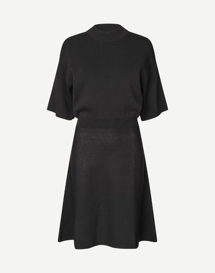 Klassikalise lõikega kootud minikleit, liibuva vöökohaga ja A-lõikelise seelikuga. Ribidega kootud krae ja vöökoht. Kõrge kaelus. Põhimaterjal on valmistatud LENZING™ ECOVERO™ viskoosi segust. See toode sisaldab LENZING™ ECOVERO™ viskoosi, mis on sertifitseeritud ELi ökomärgisega tekstiiltoodetele (litsentsi nr AT/016/001) keskkonnasäästlikkuse tagamiseks.