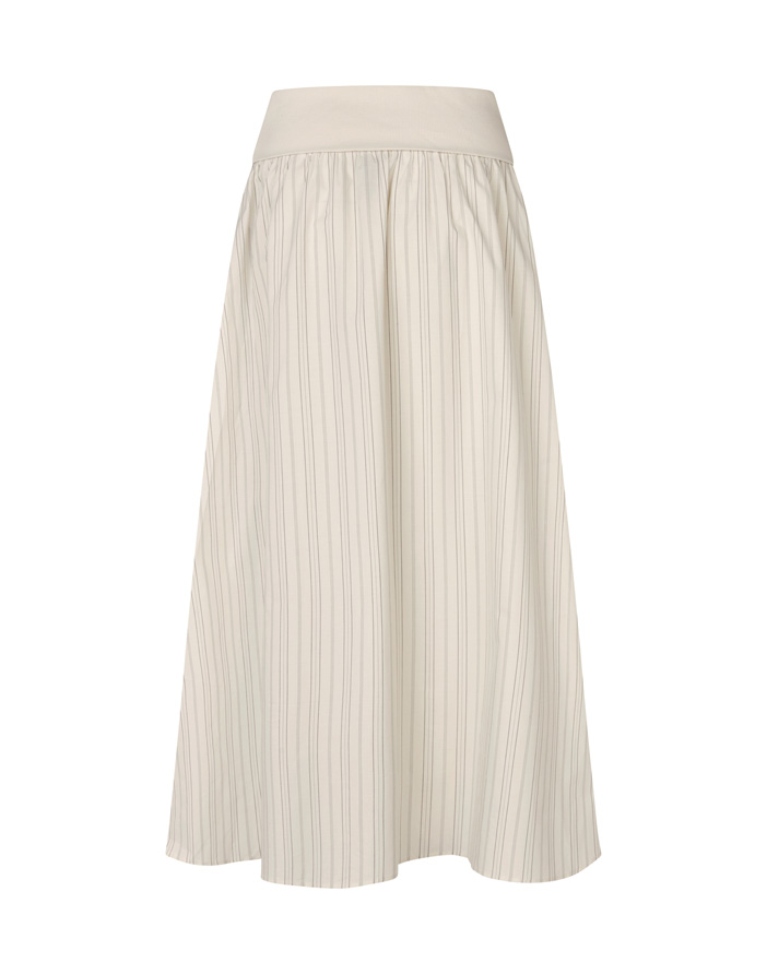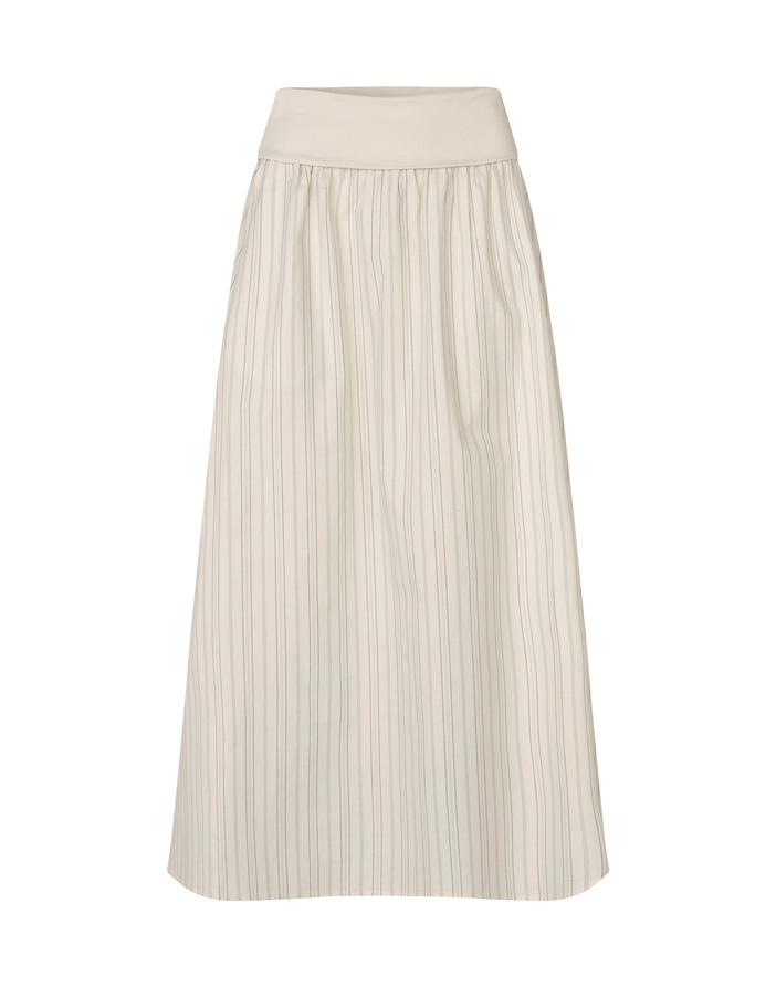 Loo viimistletud välimus Sathea seelikuga pehmes Bone toonis. Orgaanilisest puuvillast valmistatud seelik on naha vastas meeldiv ja hoiab kaunilt vormi. See on värske alternatiiv tumedatele pükstele või seelikutele, sobides hästi nii värviliste toppide kui ka neutraalsete pluusidega.
