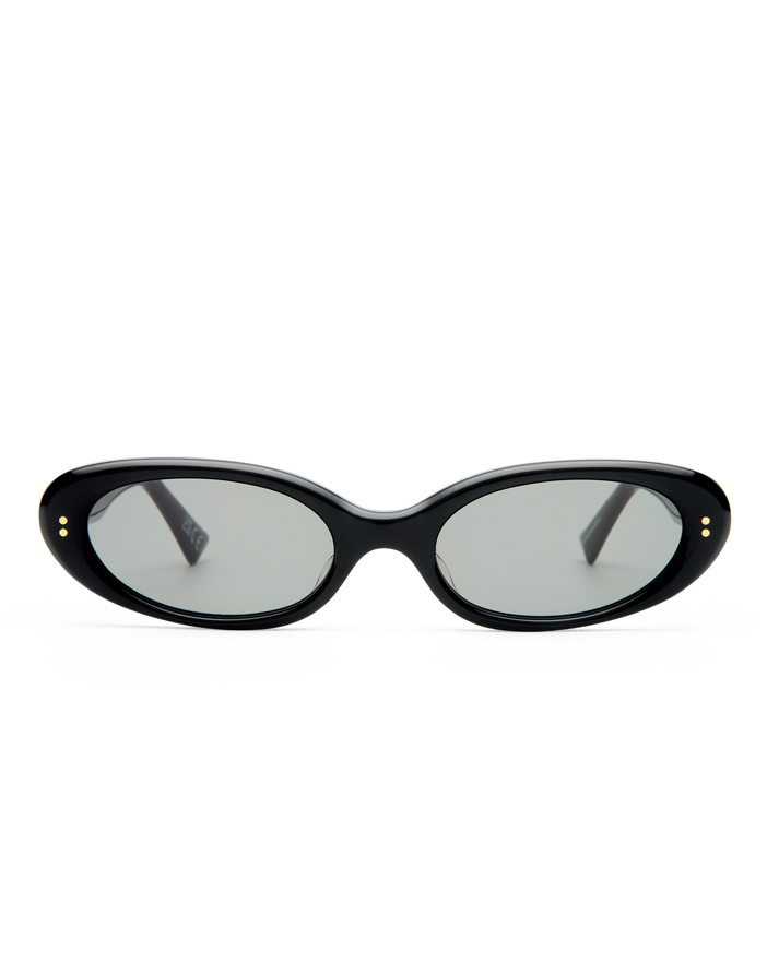 - Design features: A bold, three-dimensionally sculpted oval silhouette in polished black, accented with refined metallic hardware on the temples.