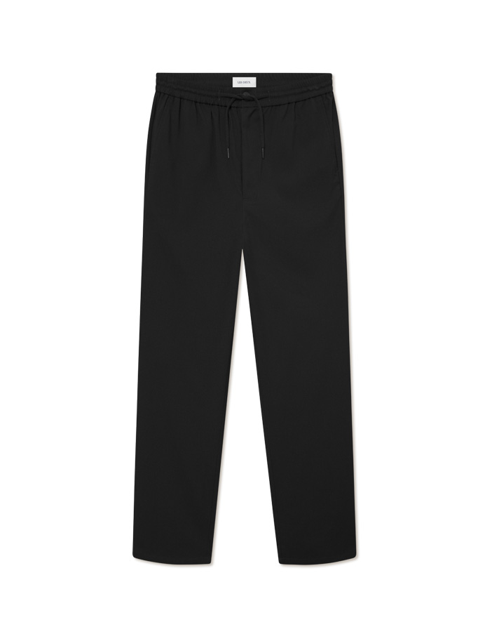 Experience effortless comfort and modern style with the Les Deux Como Tapered Drawstring Pants Dark Grey Melange. Made from a sustainable and stretchy poly-blend fabric. These casual pants feature a relaxed fit with a tapered silhouette. The elastic drawstring waist ensures a comfortable fit, while the practical pockets add functionality.