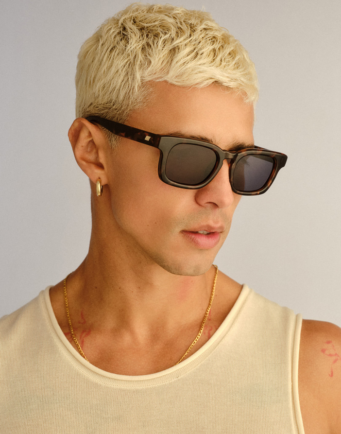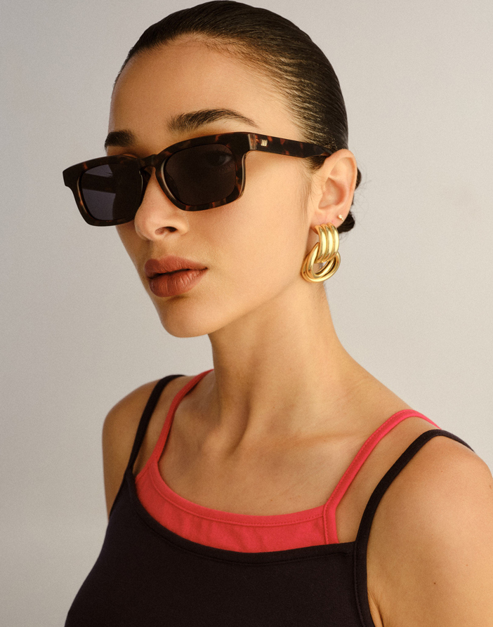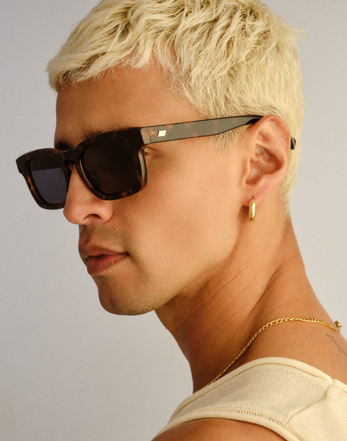- Design features: A structured square silhouette finished in a unique Tokyo tortoise pattern, highlighted by signature Le Specs detailing and the ‘+’ symbol denoting the Global Fit design.