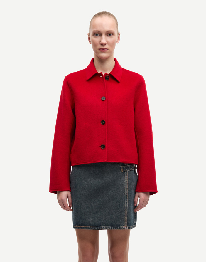 Saholly Jacket Haute Red from the Danish fashion brand Samsøe Samsøe is a eye-catching felted collared jacket with a regular fit. The elegant red jacket features a button closure and side slit pockets on the front. Crafted from a cozy blend including recycled wool.