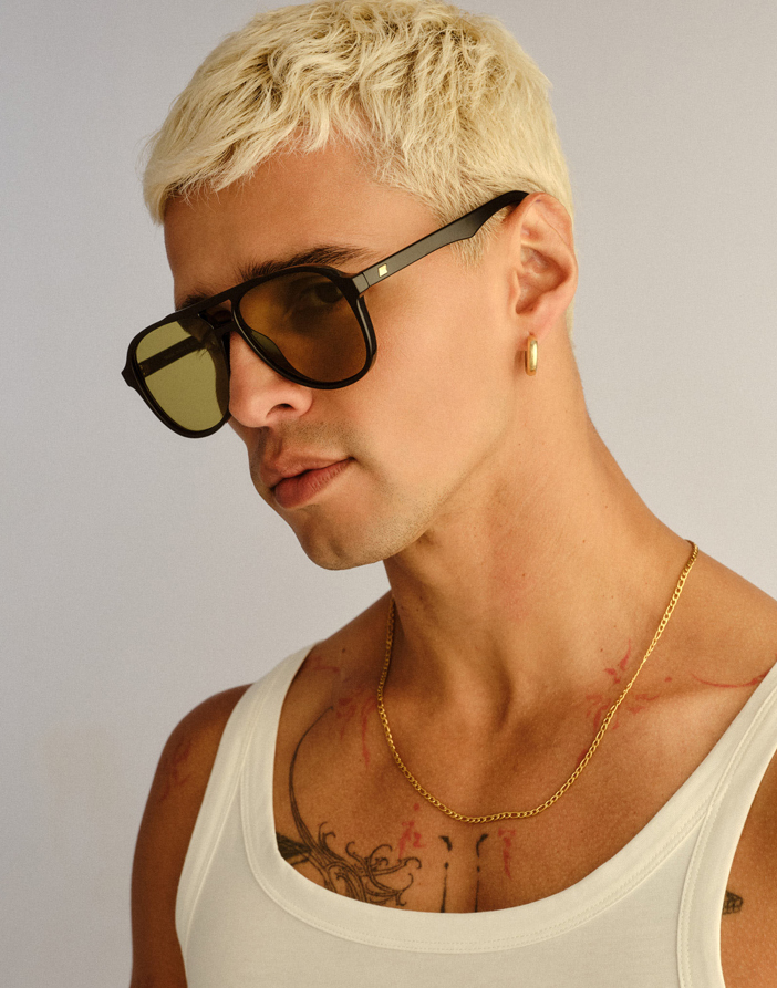 - Design features: A 70s-inspired aviator silhouette finished in black, highlighted by subtle pyramid stud detailing on the temples and Le Specs’ signature hardware.
